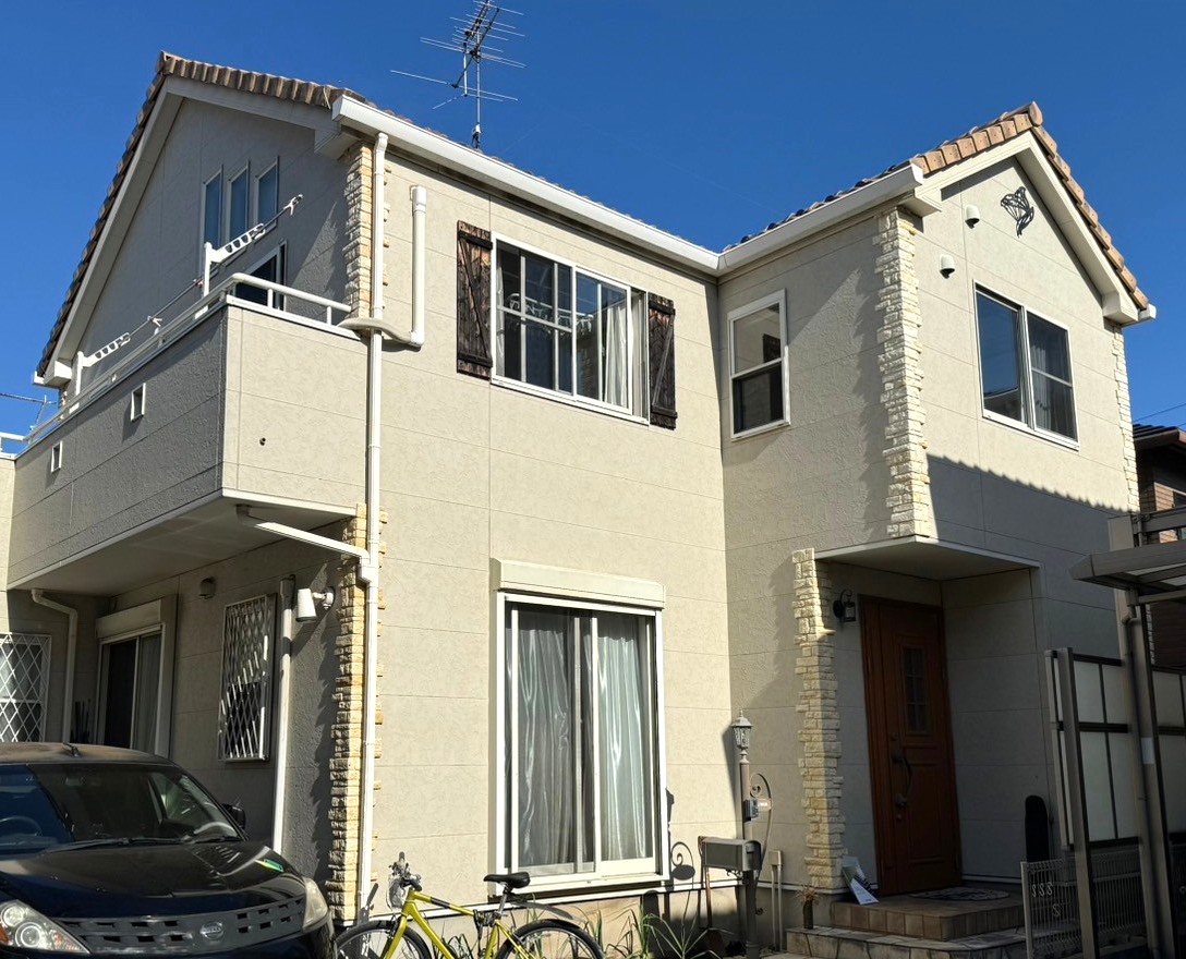 柏市豊四季にて外壁塗装工事をさせていただきました ロックペイント ハイパーユメロック ベース(白系)RP212/アクセント(ベージュ系)RP203