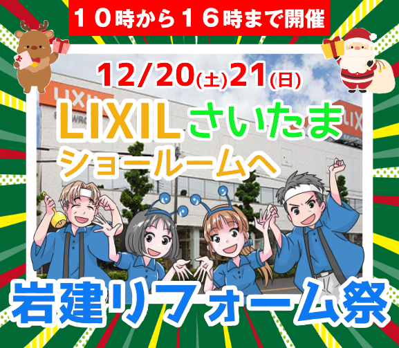 岩建ホームテックでは、来る12月20日と21日に、LIXILさいたまショールームにてリフォーム祭を開催いたします。